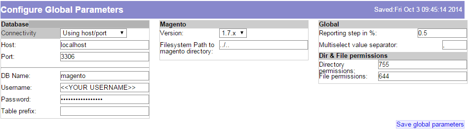 Here you will be presented with a number of different settings panels. Under Configure Global Parameters, you will need to enter your Magento web server’s SQL information.